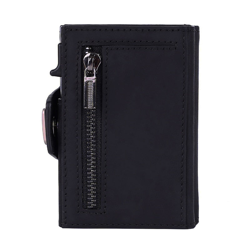 Capacity: Pop up metal card case can hold 5-6 cards.It also an hold cards, ID card, photo and notes in 6 additional slots, including 1 ID window, 2 front slots, 3 inner slots. It has a compartment for holding little cash or bills. Zippered coin pocket on the back securely stores coins and keys.